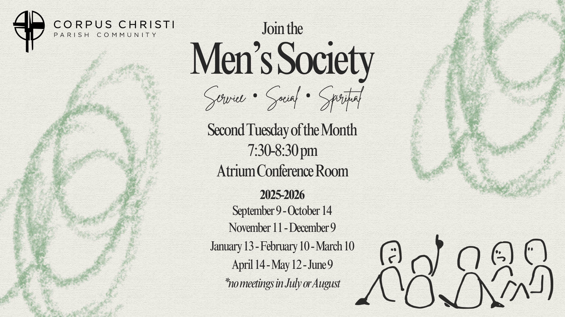 The Men's Society meets on the second Tuesday of each month from 7:30-8:30 pm, from September through June. Focus includes projects with service, social, and spiritual focus.